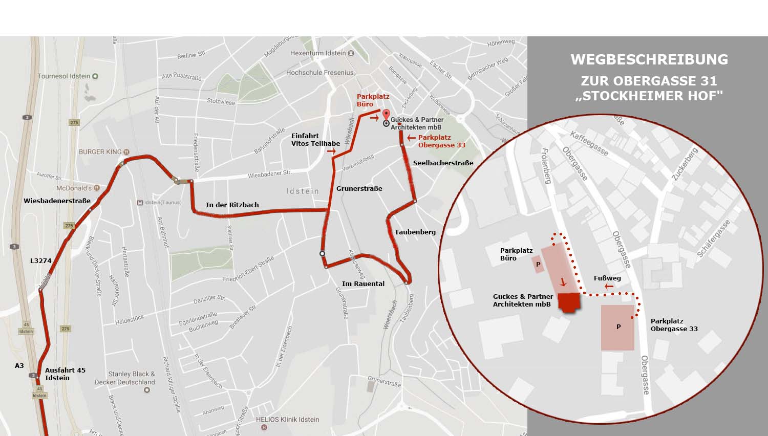 dem Straßenverlauf der Wiesbadener Straße. Alternativ können Sie rechts in die Grunerstraße abbiegen und anschließend links über die Straße im Rauental und den Taubenberg, sowie die Seelbacherstraße zu den Parkplätzen in der Obergasse 33 gelangen. Von dort erreichen Sie unser Büro fussläufig über den Frölenberg, gegenüber des Hotels „Höerhof“. |